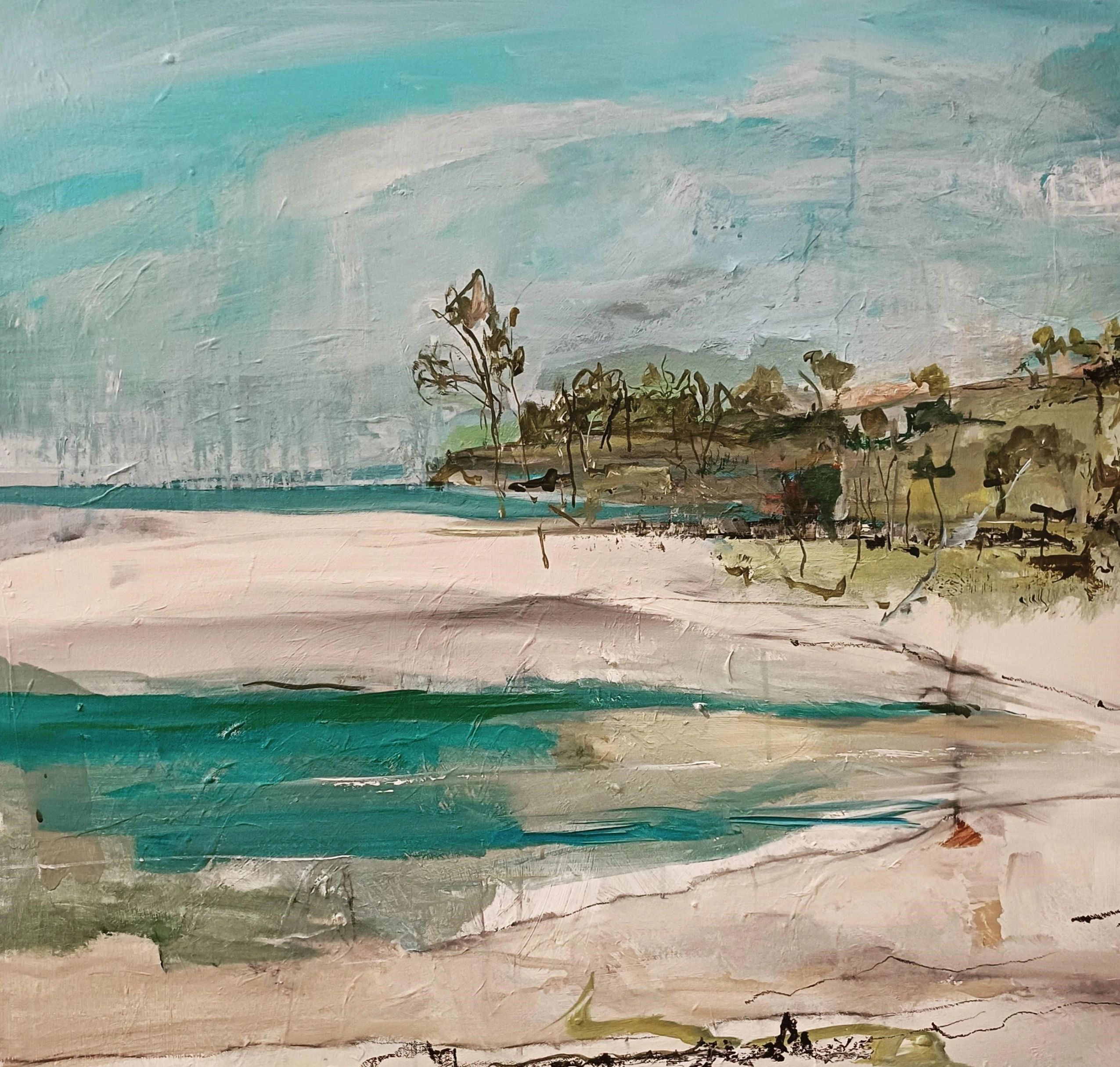 At the beach! Minjerribah, Adder Rock, Straddie, inspired, on board, 60x40cm 2023 #atthebeach #beachart #minjerribah #artinspiration #mixed media #acrylicsonboard #acrylicink #australianlandscapes #eucalyptus #paperbacks