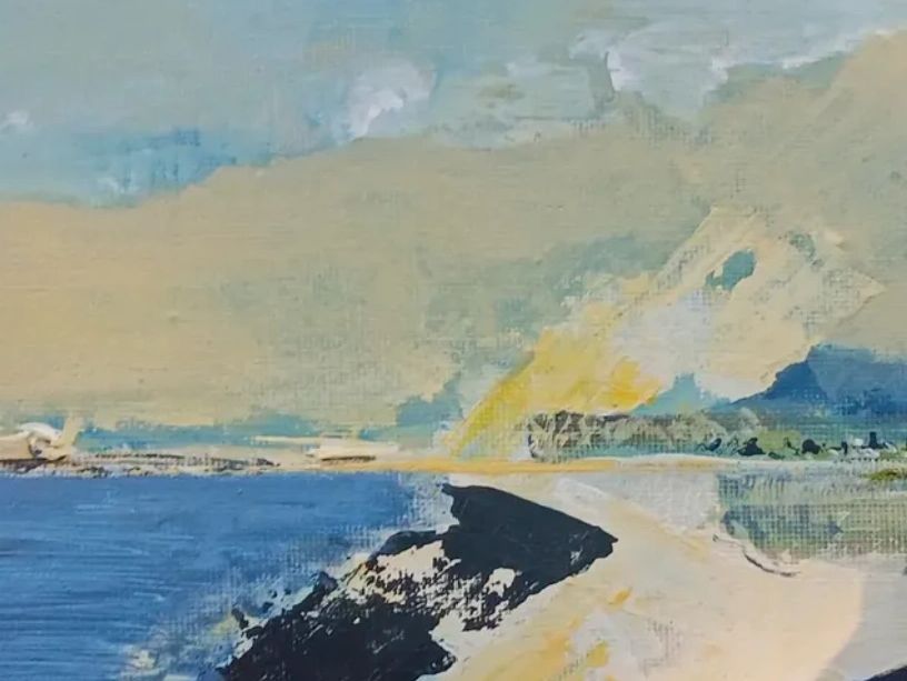 November 2024,  ☮️ Sold, Returning to Straddie through painting today at Art with Love. Sealines skipping along a lagoon edge. On board 90 x 50cm, acrylic ink and paint.